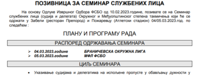 ОБАВЕЗНИ СЕМИНАР ТРЕНЕРА ЛИГА ФСБО – РЕСТОРАН „ПРЕПОРОД“ ЗАБЕЛА – УТОРАК 07.03.2023. Обавезни семинар тренера лига ФС Браничевског округа одржаће се у уторак 07.03.2023.године у 17,00 часова у ресторану „Препород“ у Забели. На семинар су обавезни да дођу сви тренери Браничевске окружне лиге, МФЛ Дунав и МФЛ Млава. Предавач на семинару биће Марко Јовановић, шеф […]