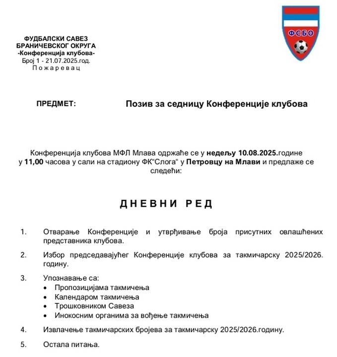 ПОЗИВ ЗА КОНФЕРЕНЦИЈУ КЛУБОВА МФЛ МЛАВА ФСБО – СТАДИОН ФК„СЛОГА“ ПЕТРОВАЦ НА МЛАВИ, НЕДЕЉА 10.08.2025. У 11,00 ЧАСОВА