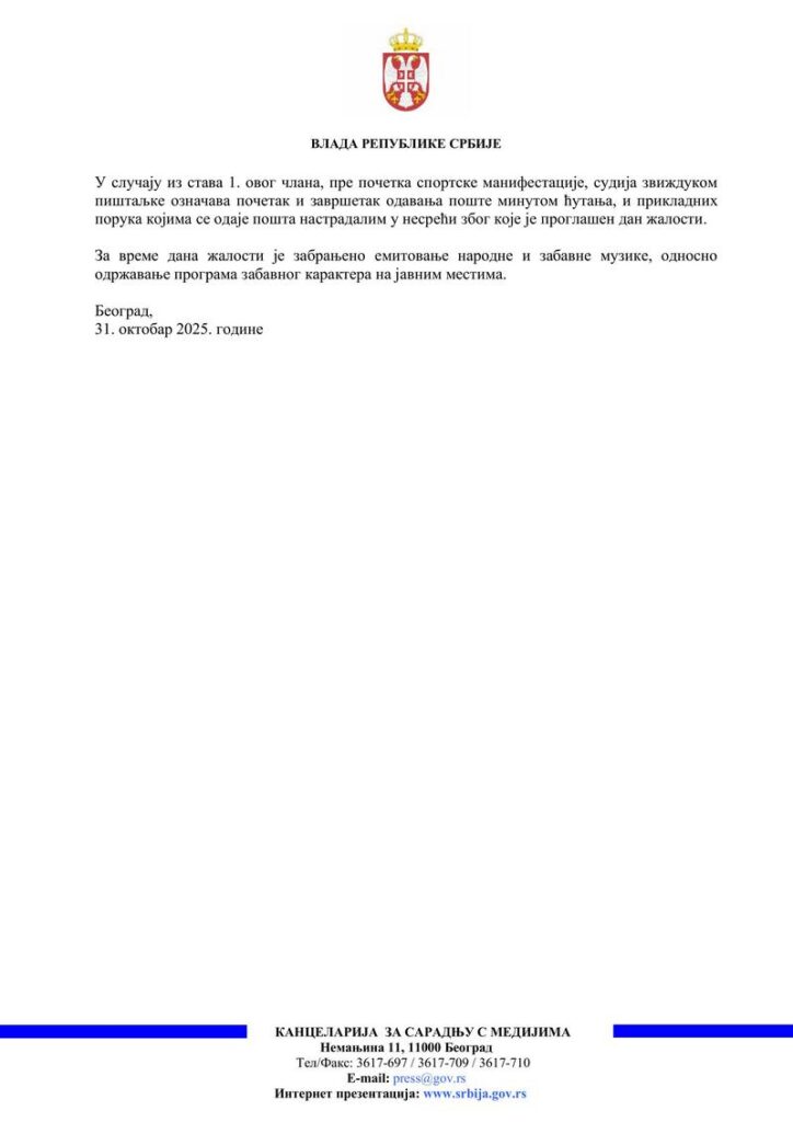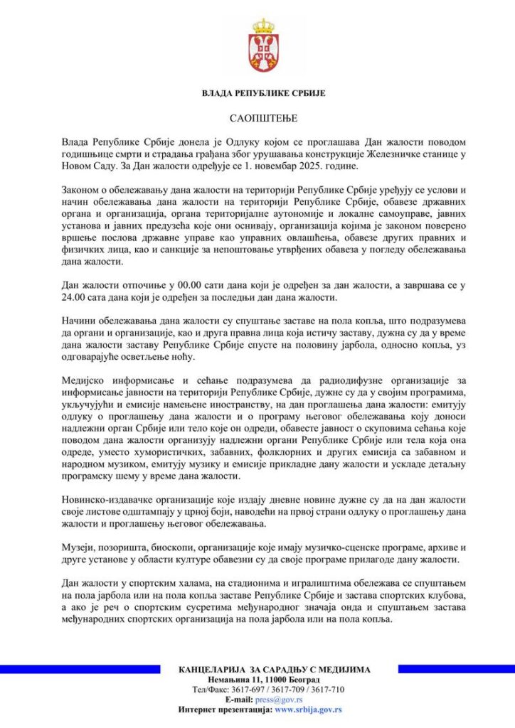 донела је Одлуку којом се проглашава Дан жалости поводом годишњице смрти и страдања грађана због урушавања конструкције Железничке станице у Новом Саду.