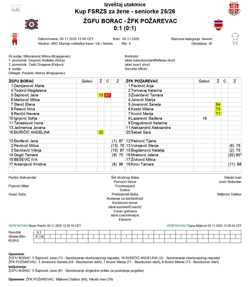 ЖГФУ“БОРАЦ“ Чачак – ЖФК“ПОЖАРЕВАЦ“ Пожаревац 0:1 (0:1)