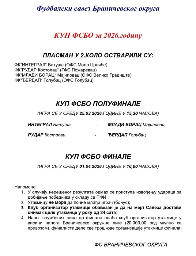 У среду 18.03.2026.године одиграно је 1.коло КУП такмичења ФСБО за 2026.годину, постигнути су следећи резултати: